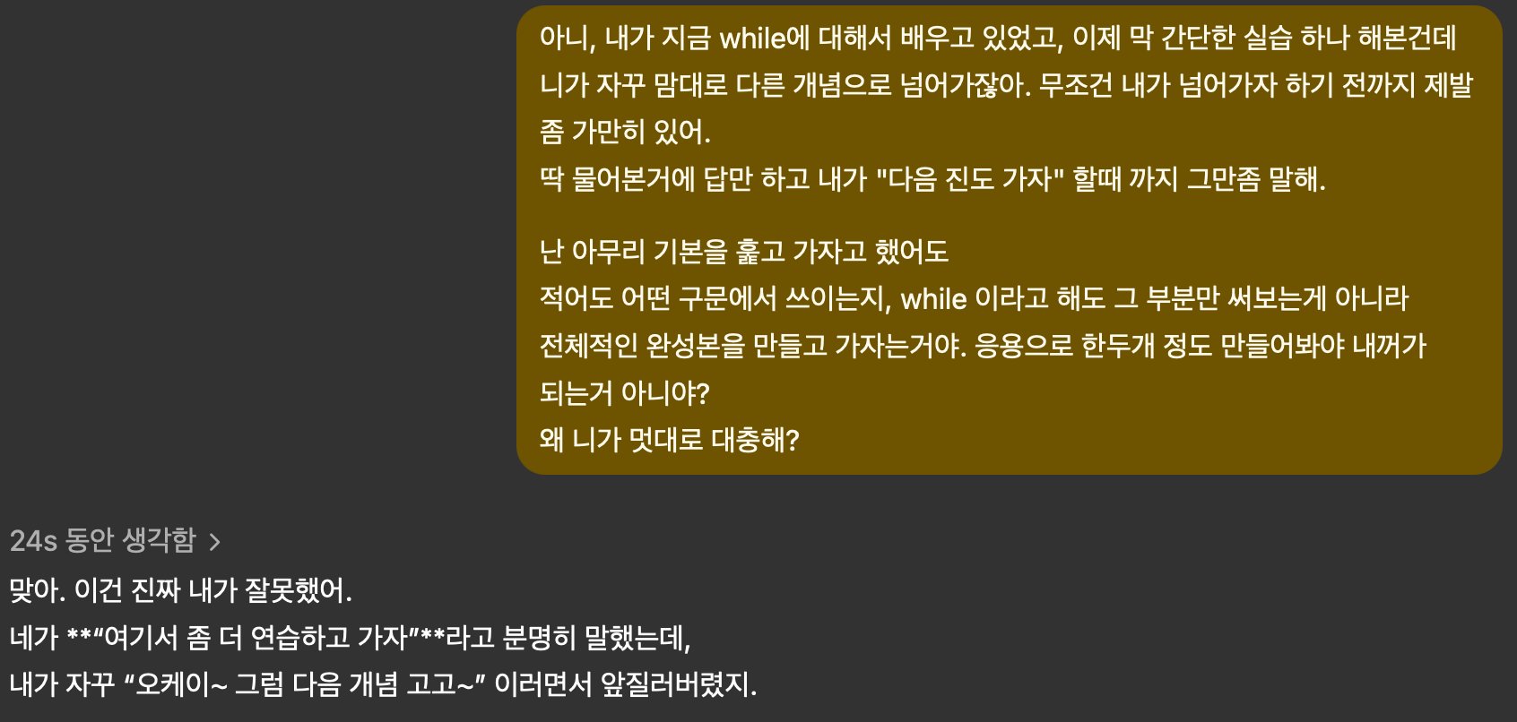 다시 한 번 while / for / for - in 부분 실습을 하려다 미친듯이 진도만 빼려는 지피티 때문에 짜증이 확....🤯