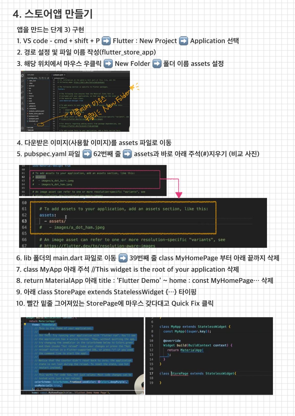 스토어 앱 만들기 부분에서 조금 디테일하게 총 2회 시청하며 앱 개발을 시작할 때 세팅 부분에 대해 필기하고,