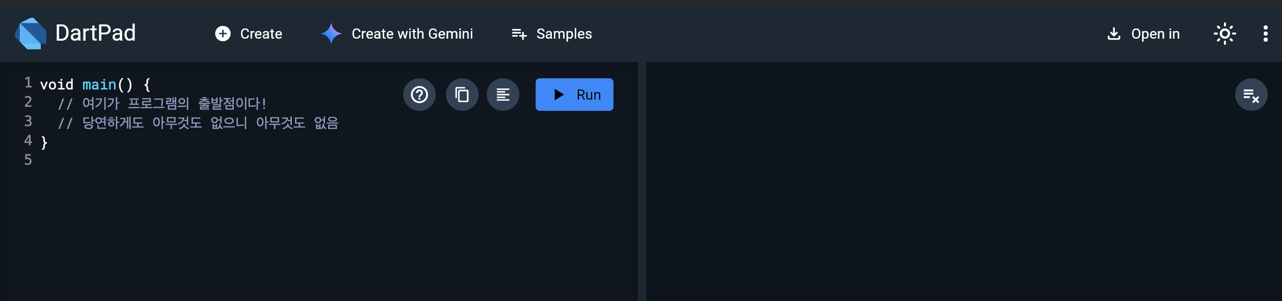 - DartPad, VS Code, Flutter 모두 main()에서 시작