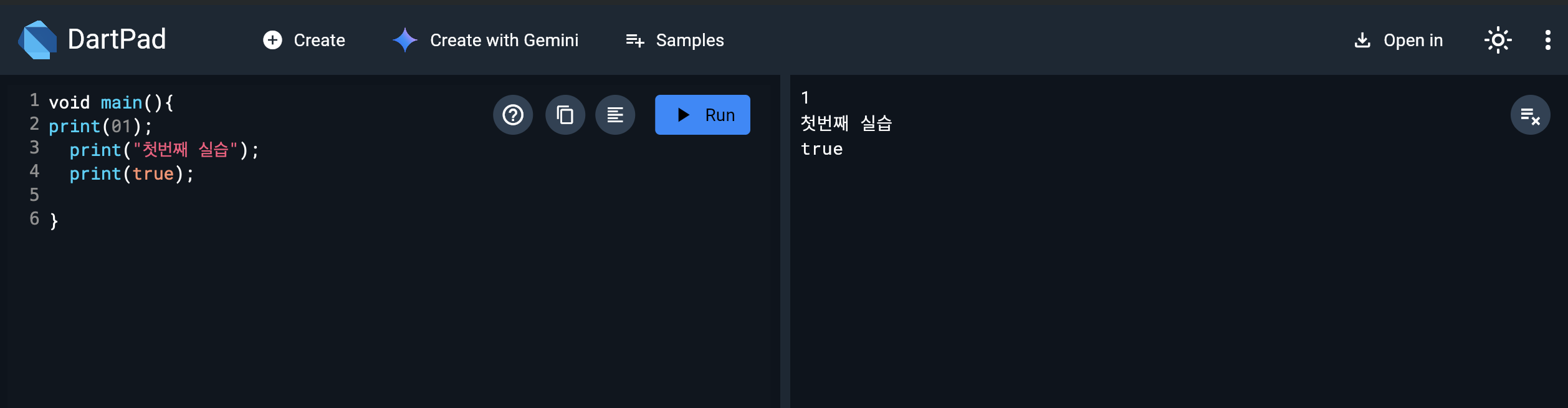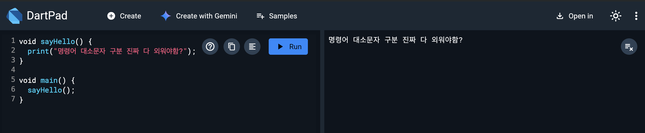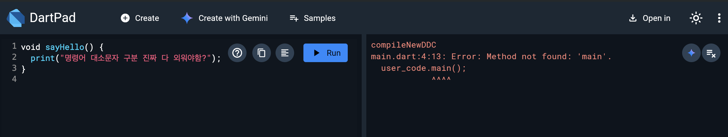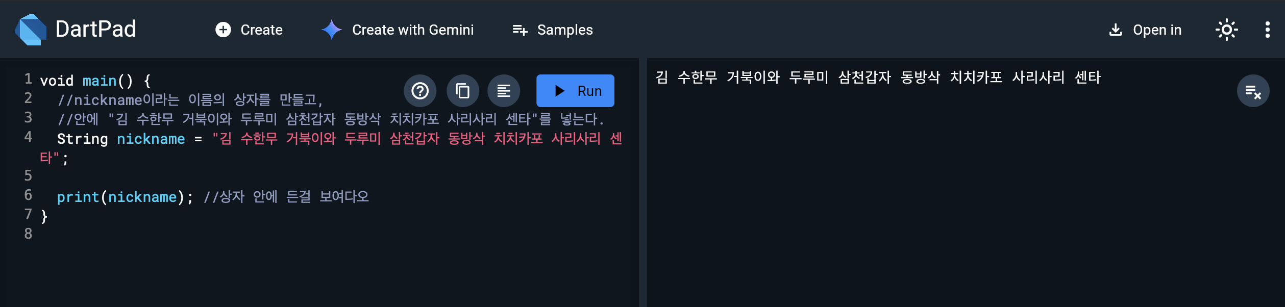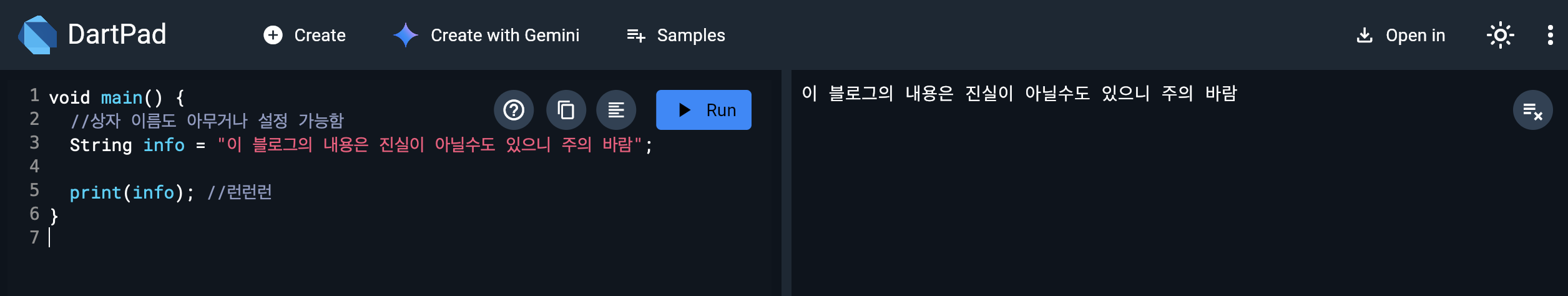 < 사용한 프로그램 "다트패드(DartPad)" 다운 받을 필요없이 웹에서 실습 가능, 바로바로 보여서 너무 편하다 >